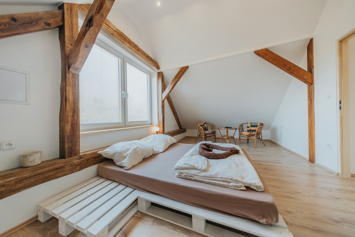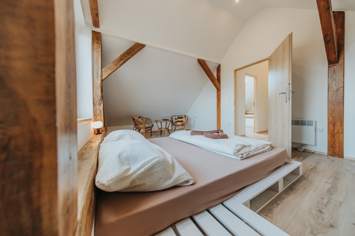 Podkroví: ložnice,, panorama" - manželská postel, ložnice,, mini" - 2 lůžka (možno samostatně či pro pár), ložnice,, vedle koupelny" - dvě samostatná lůžka, možnost přistýlky - rozkládací gauč v obýváku pro dvě osoby.