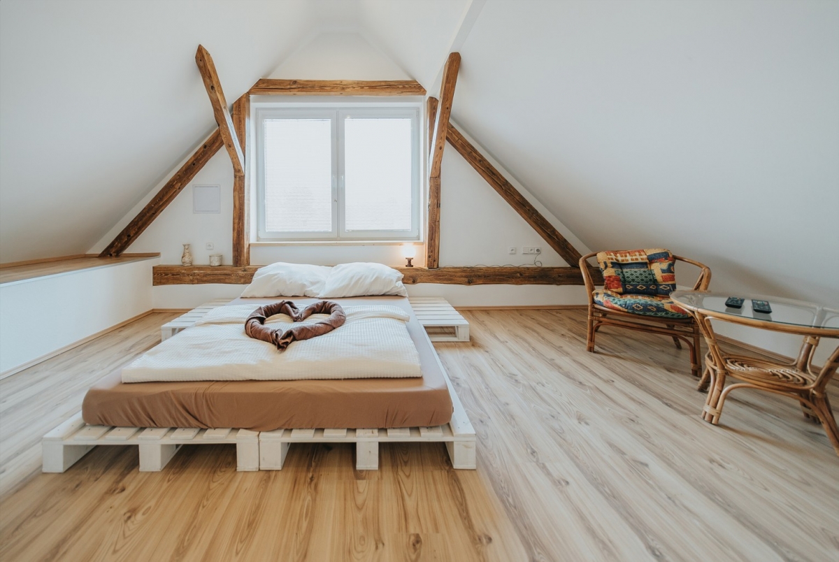 Podkroví: ,, panorama" ložnice - manželská postel z europalet, TV, konferenční stolek 2 židle, ,, malá ložnice" 2 lůžka, malá ložnice se dvěma lůžky, ložnice se samostatnými lůžky (2x), sezení s konferenčním stolkem, TV.