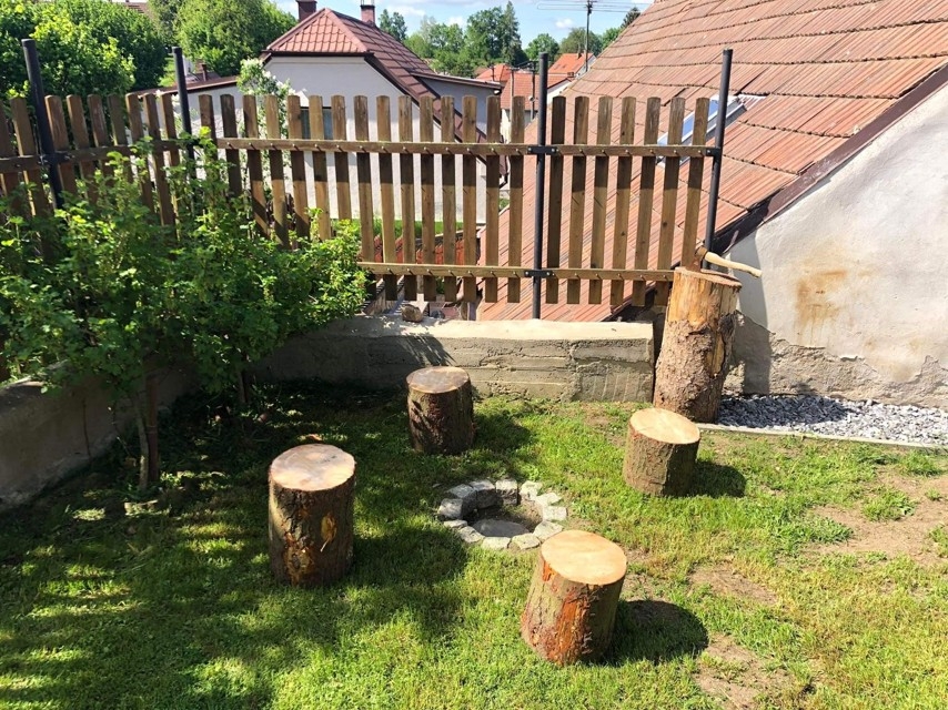 Venkovní sezení - gril, posezení se slunečníkem, uzamykatelná místnost na kola.