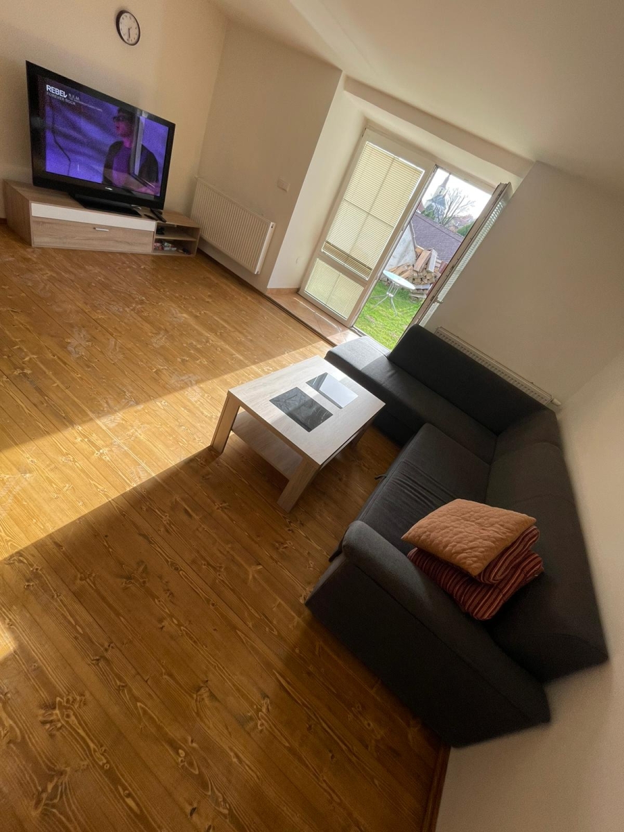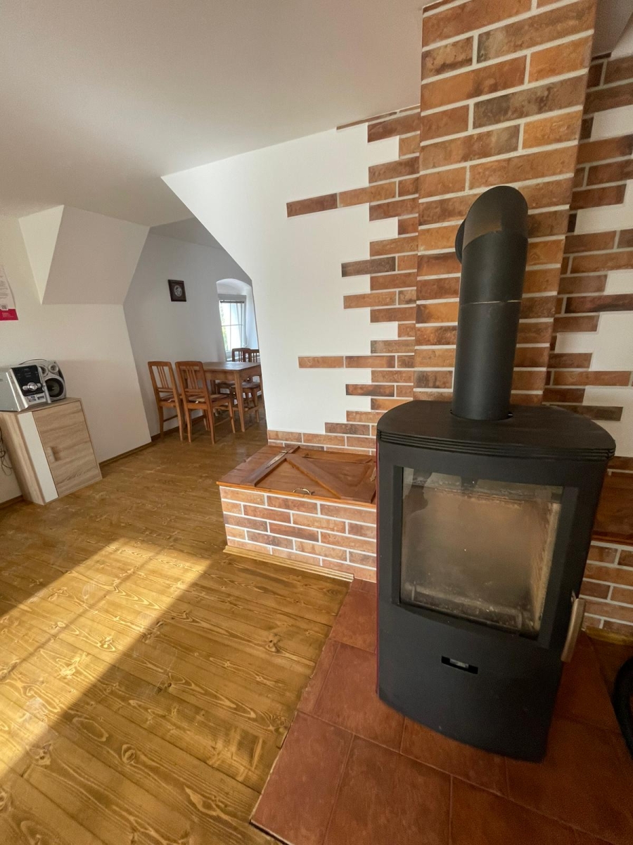 Obývací pokoj - rozkládací gauč (možná i jako přistýlka pro dvě osoby), konferenční stolek, obývací stěna - chytrá televize, hifi věž, krbová kamna.